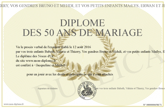 Envoyez par email votre Diplôme des 50 ans de mariage personalisé