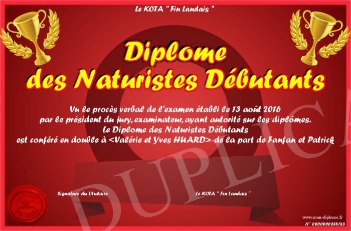 Envoyez par email votre Diplôme des Naturistes Débutants personalisé