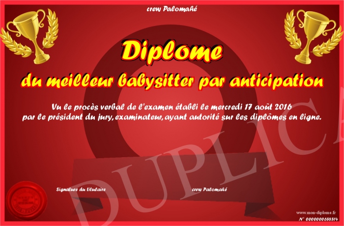 Envoyez par email votre Diplôme du meilleur babysitter par anticipation personalisé