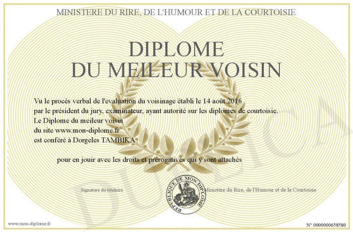 Envoyez par email votre Diplôme du meileur voisin personalisé