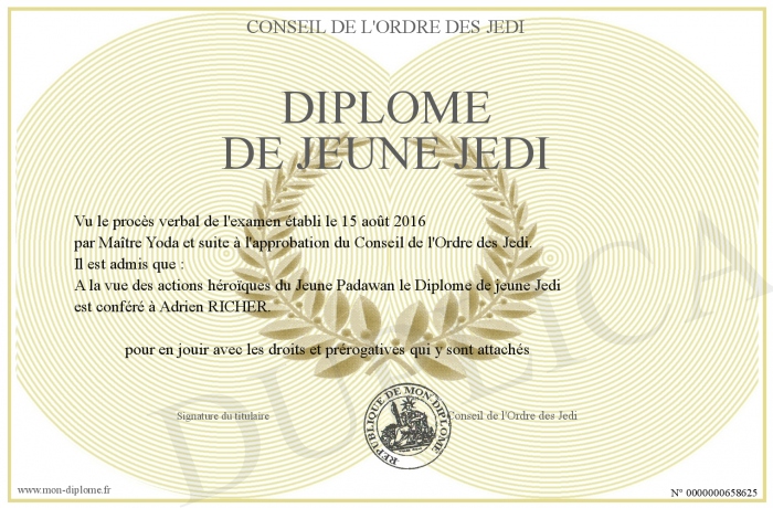 Envoyez par email votre Diplôme de jeune Jedi personalisé