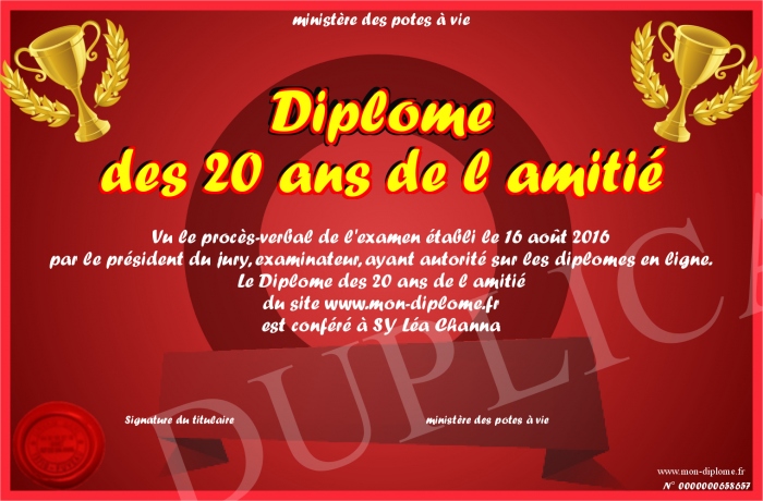 Envoyez par email votre Diplome des 20 ans de l amitié personalisé