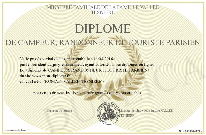 Envoyez par email votre Diplome de CAMPEUR, RANDONNEUR et TOURISTE PARISIEN personalisé