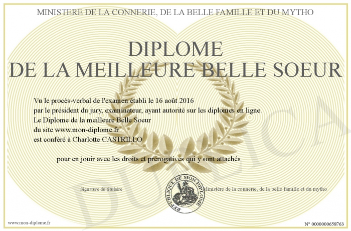 Envoyez par email votre Diplôme de la meilleure Belle Soeur personalisé