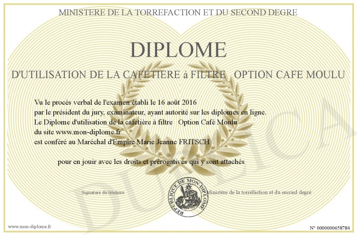 Envoyez par email votre Diplôme d'utilisation de la cafetière à filtre Option Café Moulu personalisé