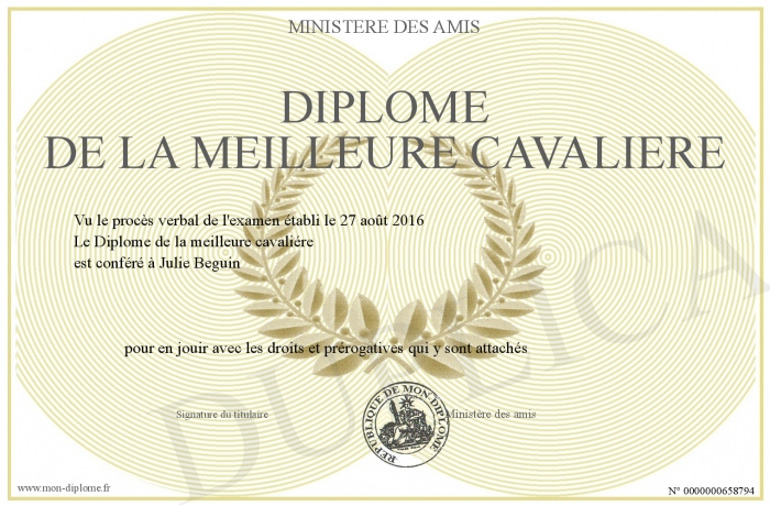 Envoyez par email votre Diplôme de la meilleure cavaliére personalisé