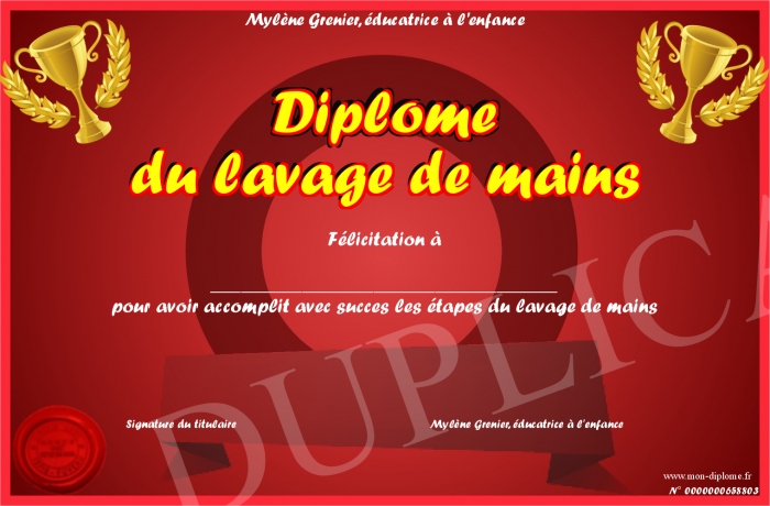 Envoyez par email votre Diplôme du lavage de mains personalisé