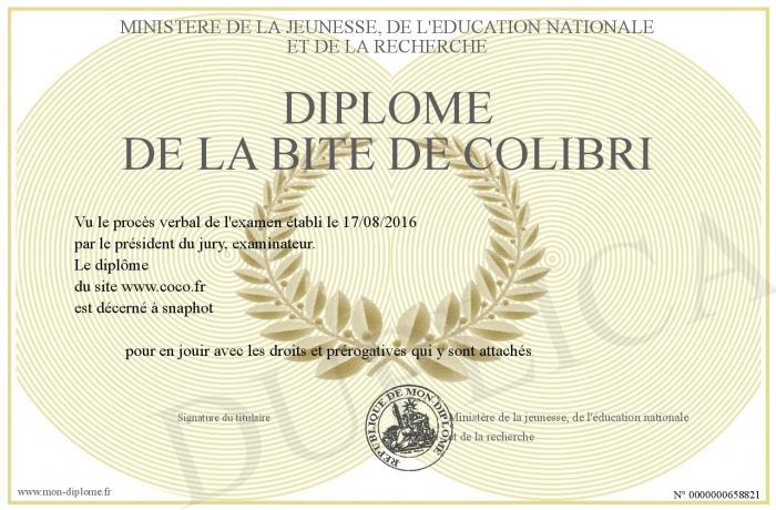Envoyez par email votre Diplôme de la bite de colibri personalisé