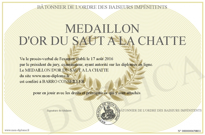 Envoyez par email votre MEDAILLON D'OR DU SAUT A LA CHATTE personalisé