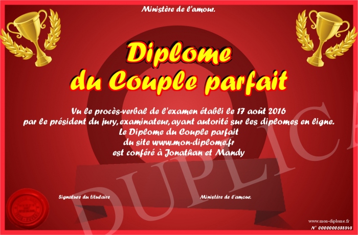 Envoyez par email votre Diplôme du Couple parfait personalisé