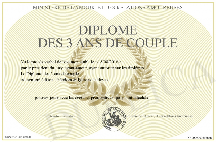 Envoyez par email votre Diplôme des 3 ans de couple personalisé