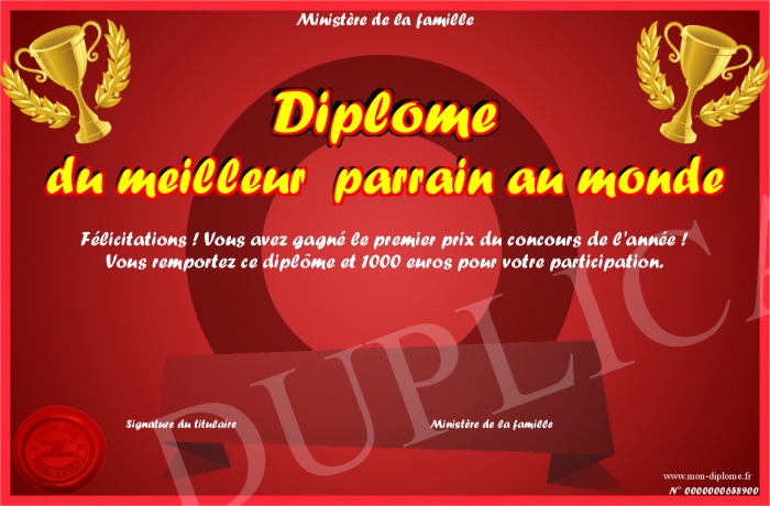 Envoyez par email votre Diplome du meilleur parrain au monde personalisé