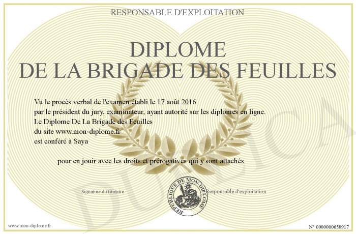 Envoyez par email votre Diplôme De La Brigade des Feuilles personalisé