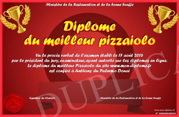 Envoyez par email votre Diplôme du meilleur pizzaiolo personalisé