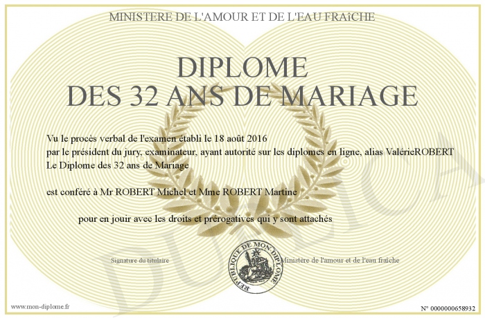 Envoyez par email votre Diplôme des 32 ans de Mariage personalisé
