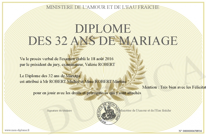 Envoyez par email votre Diplôme des 32 ans de Mariage personalisé