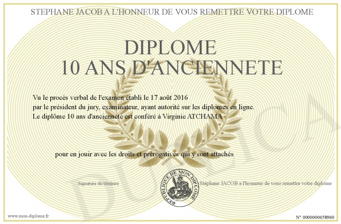 Envoyez par email votre Diplôme 10 ANS D'ANCIENNETE personalisé
