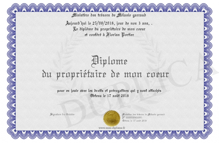 Envoyez par email votre Diplôme du propriétaire de mon coeur personalisé