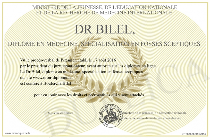 Envoyez par email votre Dr Bilel, diplômé en médecine, specialisation en fosses sceptiques. personalisé