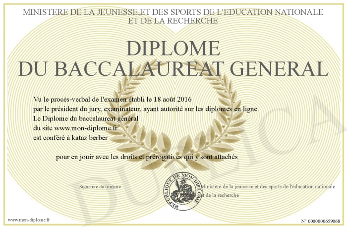 Envoyez par email votre Diplôme du baccalaureat général personalisé