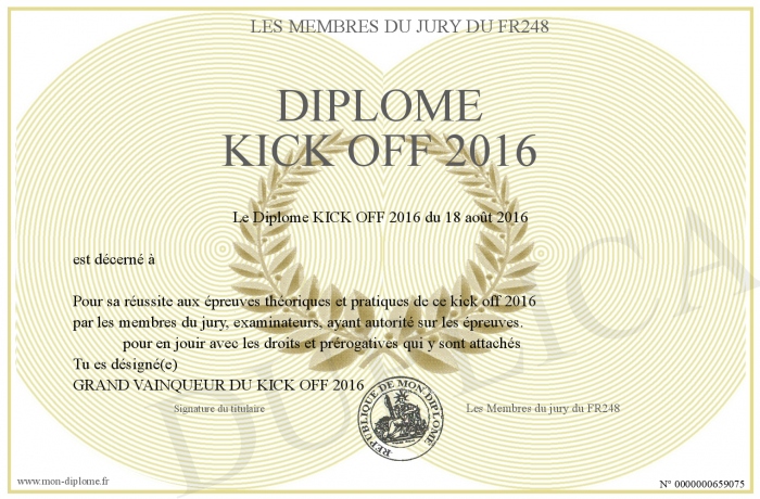 Envoyez par email votre Diplôme KICK OFF 2016 personalisé