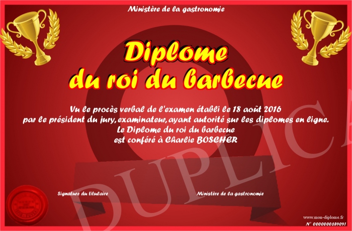 Envoyez par email votre Diplôme du roi du barbecue personalisé