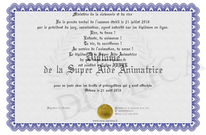 Envoyez par email votre Diplôme de la Super Aide Animatrice personalisé