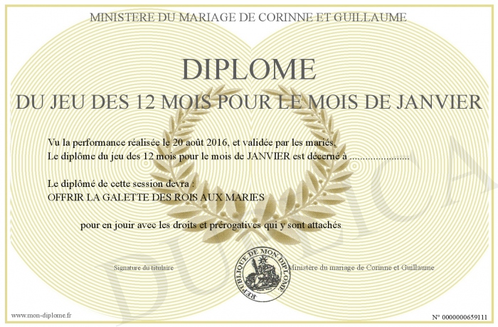 Envoyez par email votre Diplôme du jeu des 12 mois pour le mois de Janvier personalisé