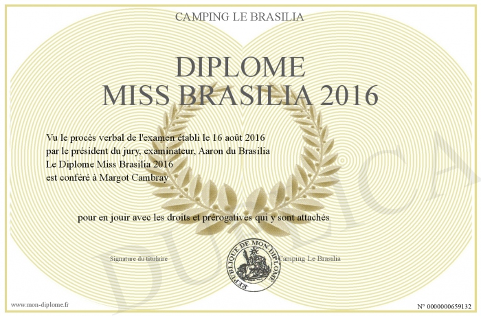 Envoyez par email votre Diplome Miss Brasilia 2016 personalisé