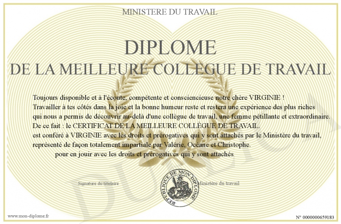 Envoyez par email votre Diplôme de la Meilleure collègue de travail personalisé