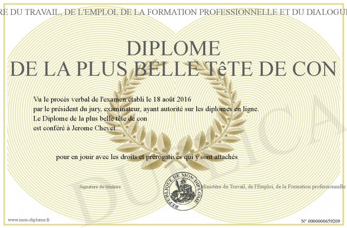 Envoyez par email votre Diplôme de la plus belle tête de con personalisé