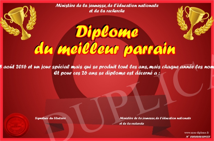 Envoyez par email votre Diplôme du meilleur parrain personalisé