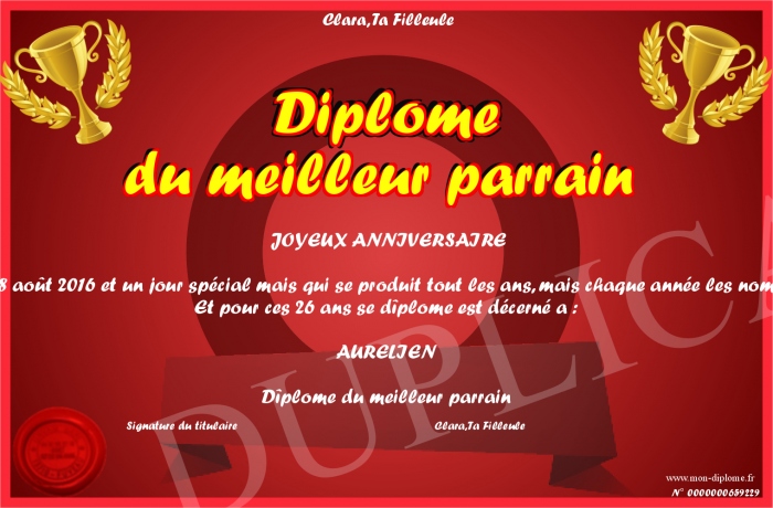 Envoyez par email votre Diplôme du meilleur parrain personalisé