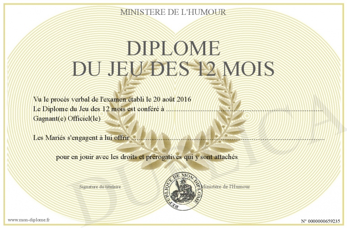 Envoyez par email votre Diplôme du Jeu des 12 mois personalisé