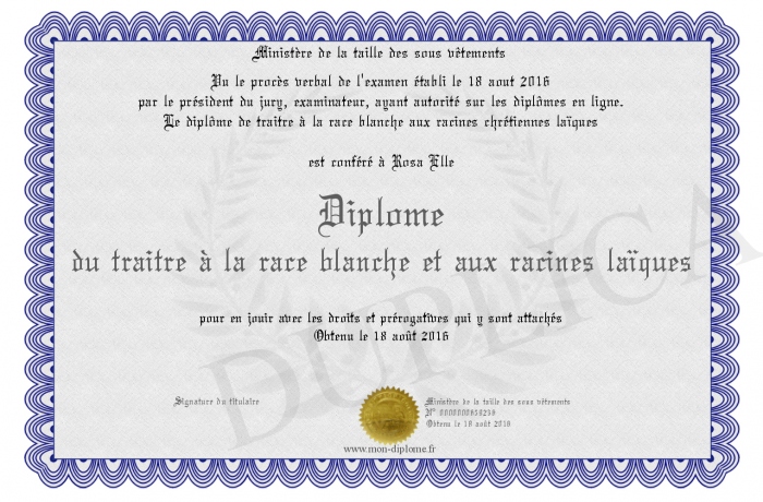 Envoyez par email votre Diplôme du traitre à la race blanche et aux racines laïques personalisé