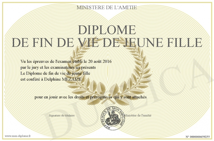 Envoyez par email votre Diplôme de fin de vie de jeune fille personalisé