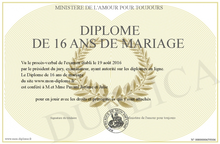 Envoyez par email votre Diplôme de 16 ans de mariage personalisé