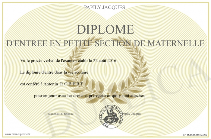 Envoyez par email votre Diplôme d'Entrée en petite section de Maternelle personalisé