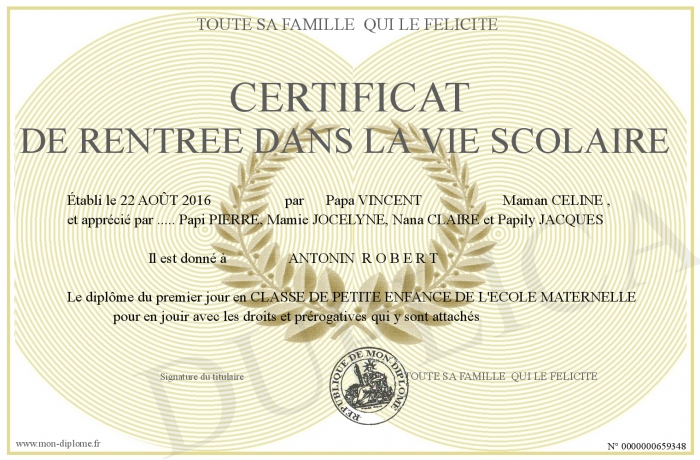 Envoyez par email votre CERTIFICAT DE RENTREE DANS LA VIE SCOLAIRE personalisé