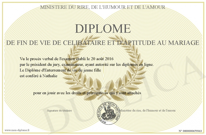 Envoyez par email votre Diplome de fin de vie de célibataire et d'aptitude au mariage personalisé