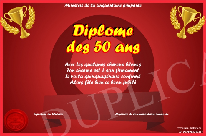 Envoyez par email votre Diplôme des 50 ans personalisé