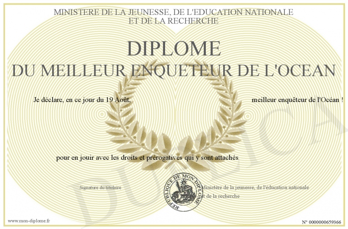 Envoyez par email votre Diplôme du meilleur enqueteur de l'Océan personalisé