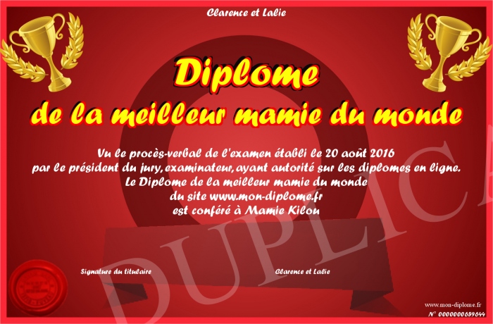 Envoyez par email votre Diplôme de la meilleur mamie du monde personalisé