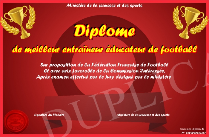 Envoyez par email votre Diplôme de meilleur entraîneur éducateur de football personalisé