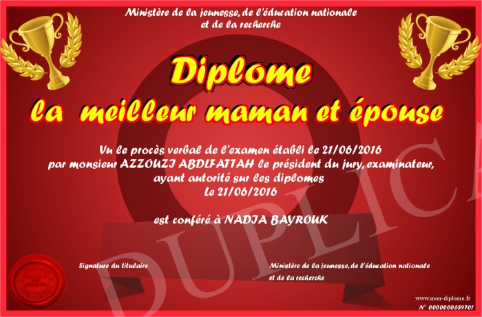 Envoyez par email votre Diplôme la meilleur maman et épouse personalisé