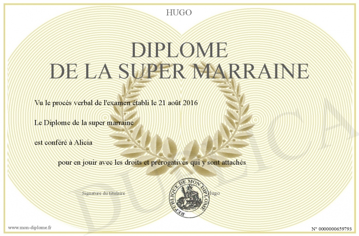 Envoyez par email votre Diplôme de la super marraine personalisé