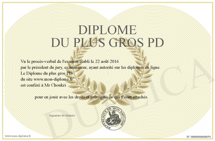 Envoyez par email votre Diplôme du plus gros PD personalisé