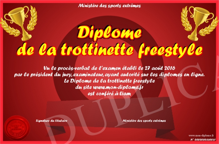 Envoyez par email votre Diplôme de la trottinette freestyle personalisé