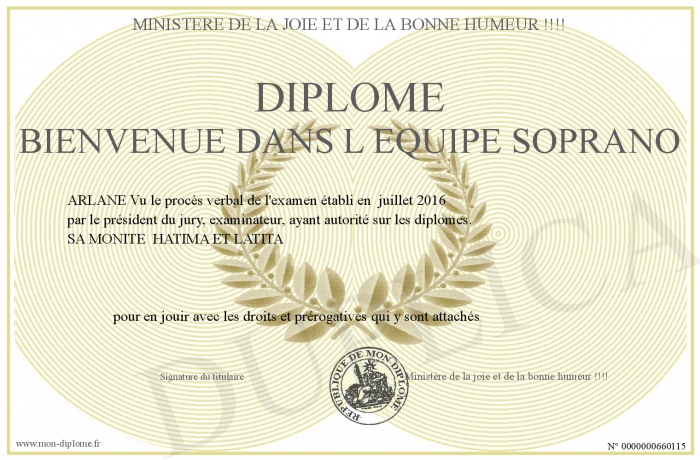 Envoyez par email votre Diplôme Bienvenue dans l équipe Soprano personalisé