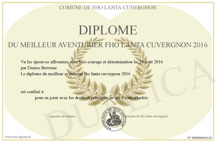 Envoyez par email votre diplôme du meilleur aventurier fho lanta cuvergnon 2016 personalisé
